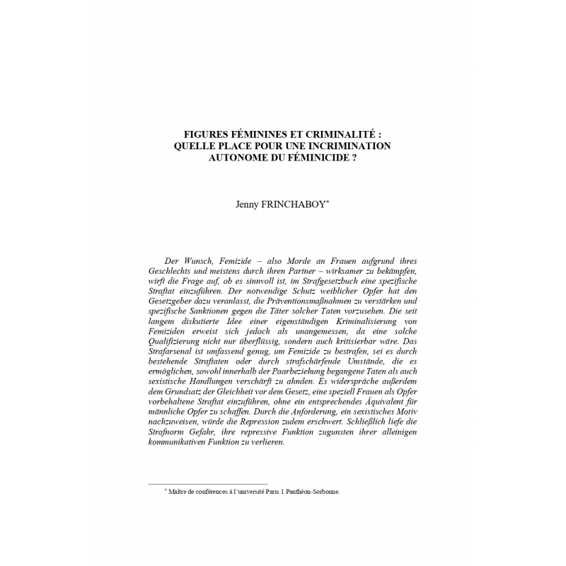 J. Frinchaboy - Figures féminines et criminalité : quelle place pour une incrimination autonome du féminicide ? - Collection Colloques volume 67, pp. 123-136.