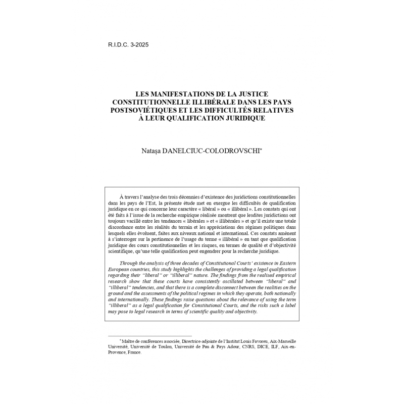 N. Danelciuc-Colodrovschi, "Les manifestations de la justice constitutionnelle illibérale dans les pays postsoviétiques", n° 3, 2025, pp. 111-132.