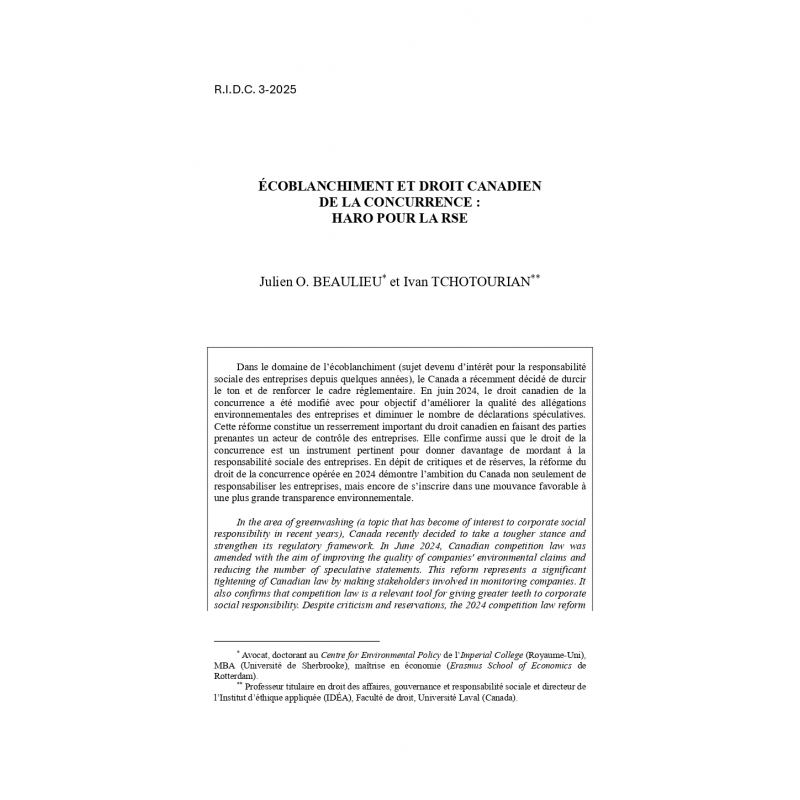 J. Beaulieu & I. Tchotourian, "Ecoblanchiment et droit canadien de la concurrence : haro pour la RSE", n° 3, 2025, pp. 213-234.