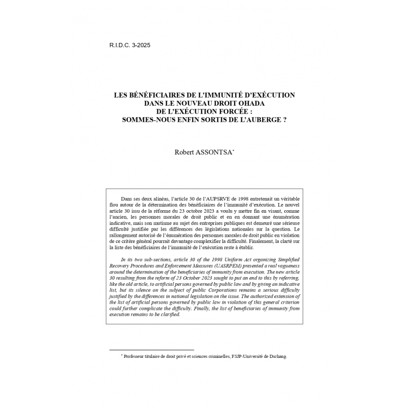 R. Assontsa, "Les bénéficiaires de l'immunité d'exécution dans le nouveau droit Ohada de l'exécution forcée", n° 3, 2025, pp. 251-264.