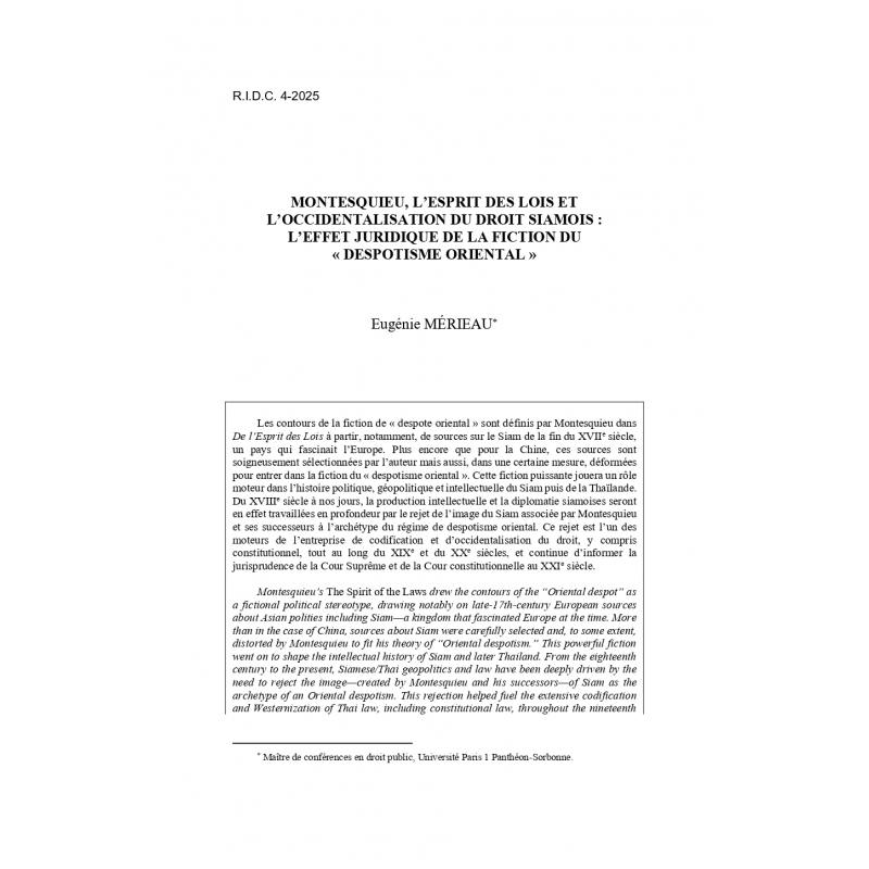 E. Mérieau, "Montesquieu, L'esprit des lois et l'occidentalisation du droit siamois", n° 4, 2025, pp. 49-72.