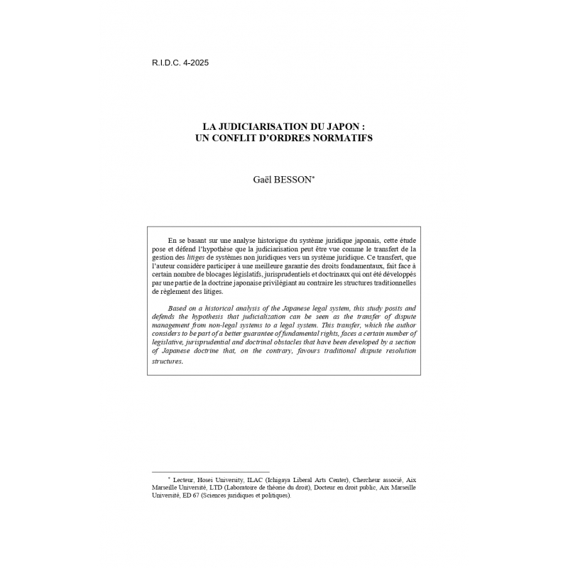 G. Besson, "La judiciarisation du Japon : un conflit d'ordres normatifs", n° 4, 2025, pp. 153-176.