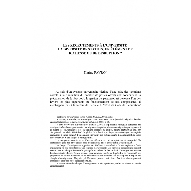 K. Favro - Les recrutements à l'université, la diversité de statuts, un élément de richesse ou de disruption ? - Collection Colloques volume 66, pp. 71-94.