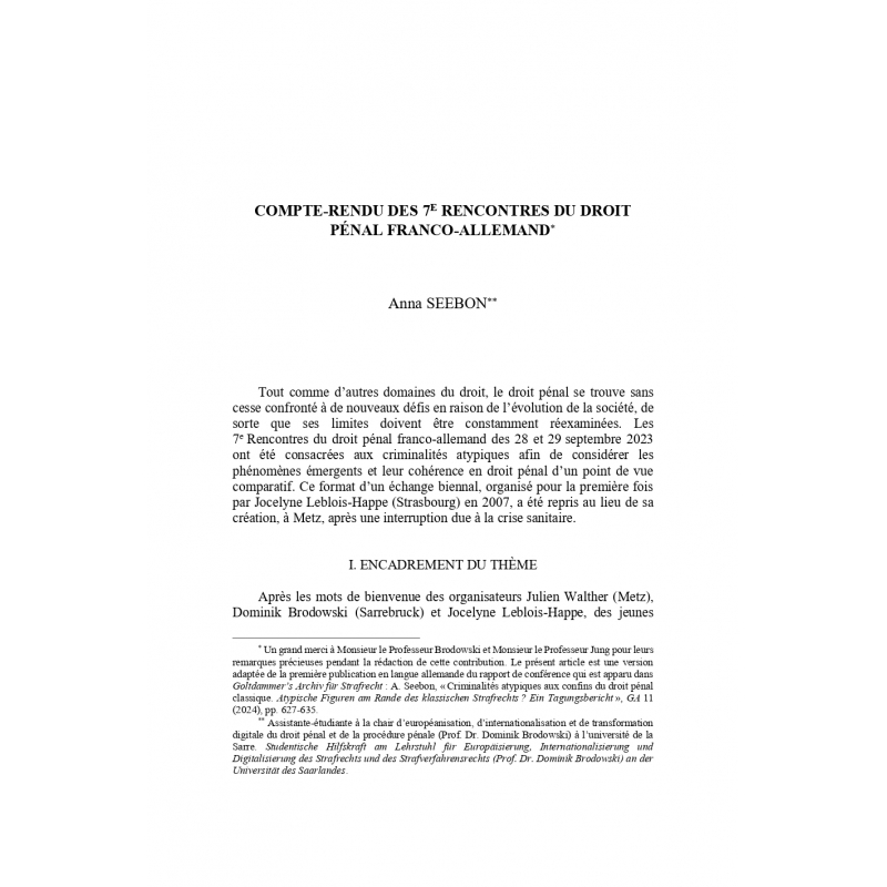 A. Seebon - Compte-rendu des 7e rencontres du droit pénal franco-allemand - Collection Colloques volume 67, pp. 231-244.