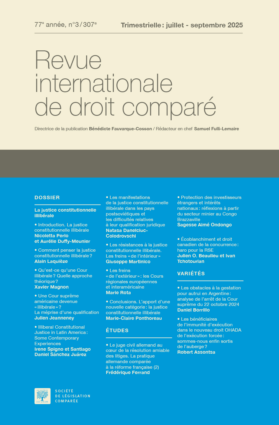 Ce périodique, seule revue générale de droit comparé publiée en France, parait depuis 1949 et est destinée à fournir aux juristes de toutes spécialités et de tous pays une formation suivie sur l’évolution de la science juridique en France et à l’étranger, tant du point de vue doctrinal que pratique.